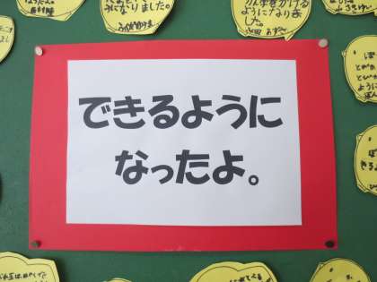 1年生の子どもたちが、今までに頑張ってきたことをカードに書き、2階の廊下に掲示しています。