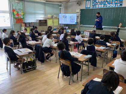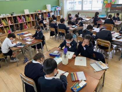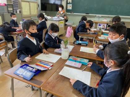 1組の生活科では、「ヒアシンス」の花を見てスケッチをしていました。ピンクや紫の花を色鉛筆で塗っています。