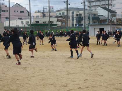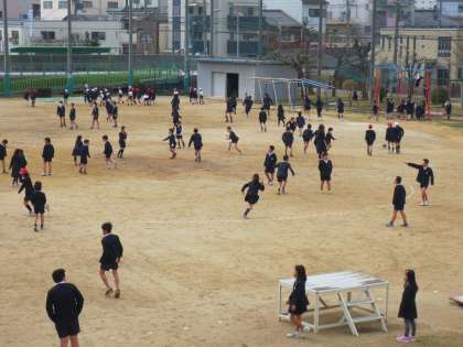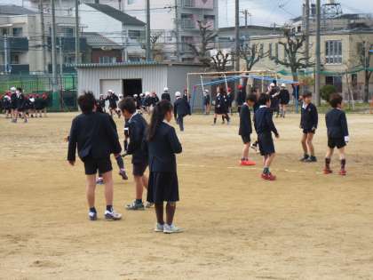寒くとも元気な子どもたちです。運動場いっぱいに広がって遊んでいます。