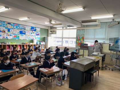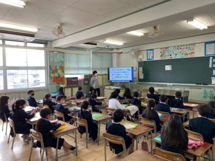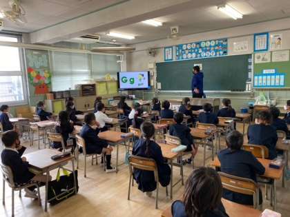 1年生の教室では、子どもたちが、大型テレビを見てアルファベットや単語を発音していました。