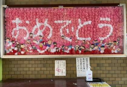 「卒業」をひかえ、お祝いの「おめでとう」の文字が浮かびあがっています。