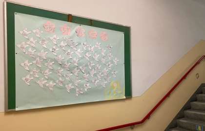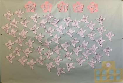 先週の「卒業生を祝う会」のお礼として、6年生から在校生へむけたメッセージが、きれいに飾り付けされ、掲示されています。