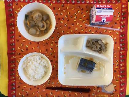 さごしのおろしじょうゆかけ、一口がんもとさといものみそ煮、れんこんのいためもの、ご飯、牛乳
