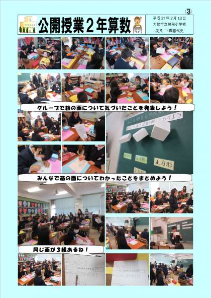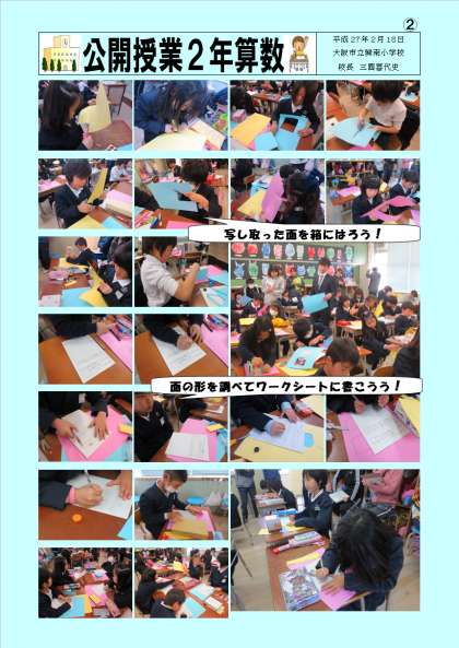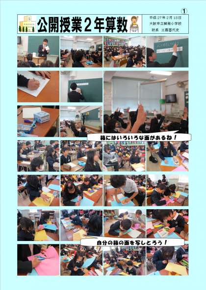 校内において、2/18算数科の公開授業を実施しました。授業を参観することで教員相互が学び教え合い、また、外部講師の指導を得て、各教員が授業力を高める機会にしています。↓