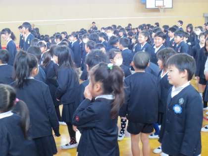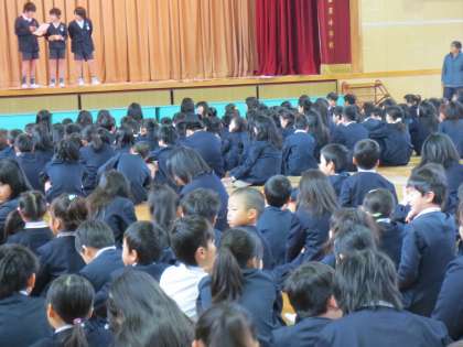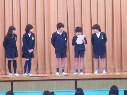 集会委員会の児童が「船長さんのめいれい」ゲームの説明をしています。全児童が縦割りグループで整列して聞いています。