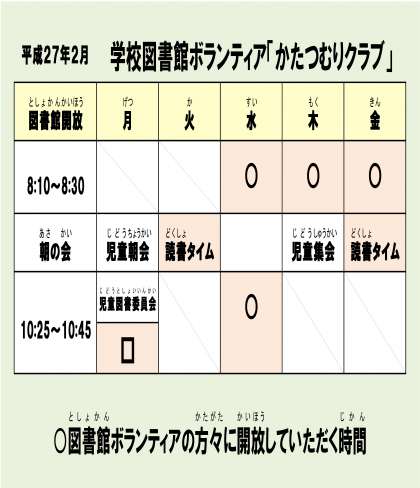 学校図書館ボランティアの「かたつむりクラブ」のみなさんが、下記の時間に図書館を開放してくださっています。また、図書の整理などにもご協力いただいております。読書の機会があれば、読書好きな子どもはかかさず行っています。ご協力ありがとうございます。【お願い】学校図書館ボランティアにご協力いただける方がおられましたら、PTA副会長の岡 久美子さん、もしくは学校の方にご連絡くださいますよう、よろしくお願いいたします。