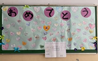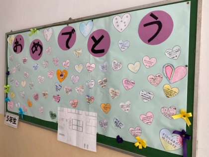 各学年の掲示板には6年生の卒業を祝福する言葉や作品が飾られています。