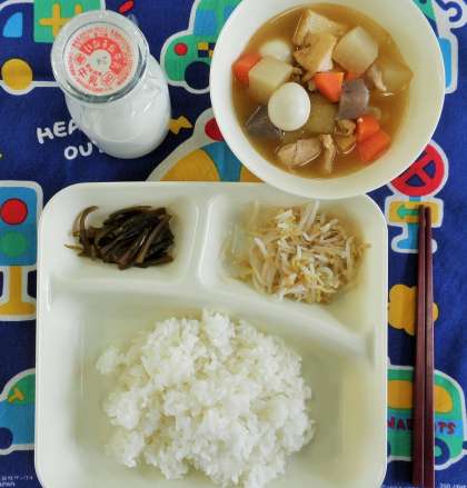 関東煮、もやしのゆず風味、茎わかめのつくだ煮、ご飯、牛乳