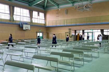 1組・2組の入場のようすです。担任の先生に続き、間隔をとってゆっくり歩いています。