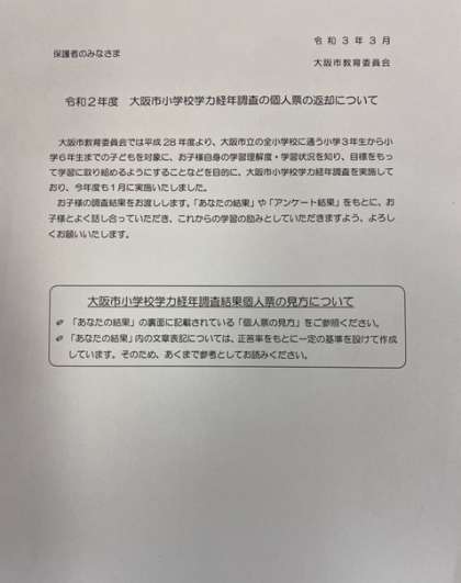 本日、6年生の児童に「大阪市小学校学力経年調査」の個人票を返却しました。大阪市教育委員会よりの鑑文を添付しております。