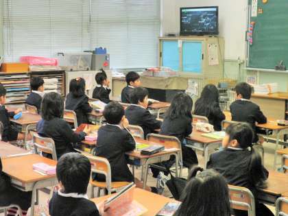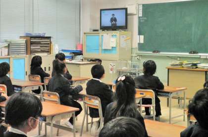 今朝は、雨上がりのため「テレビ朝会」を行いました。