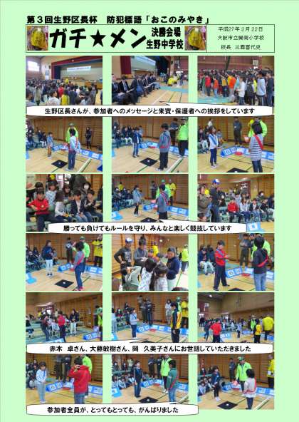 2/22(日)第3回 生野区長杯の決勝が生野中学校で行われました。巽南小学校より2チーム10名の児童が参加しました。チームのお世話や指導は、赤木 卓さん、大藤敏樹さん、岡 久美子さんにしていただきました。ありがとうございました。どの児童も元気いっぱいに取り組んでいました。
