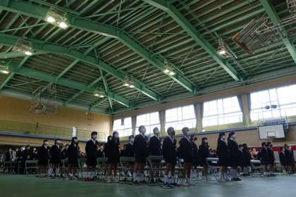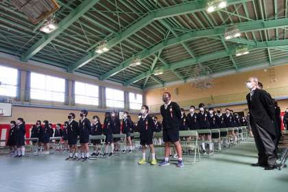 国歌・市歌・校歌の斉唱です。