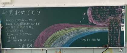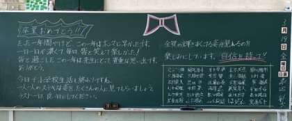 6年生が卒業し、誰もいなくなった教室の黒板に、担任の先生からの暖かい言葉が残されていました。