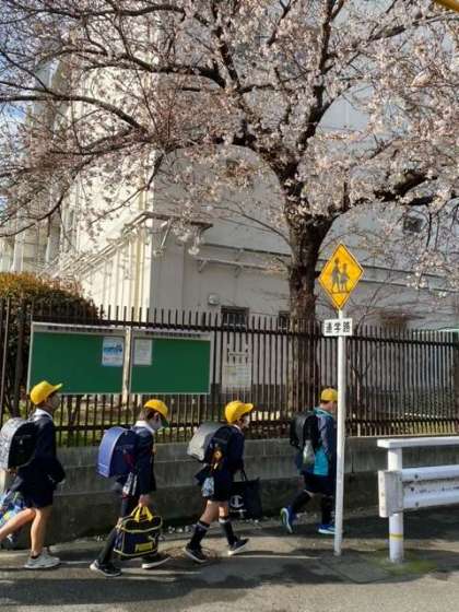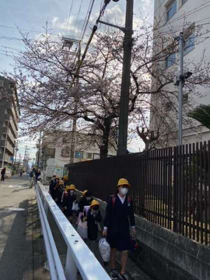 新たに最高学年となる5年生の班長さんを中心に子どもたちが集団登校してきました。