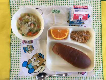 とうふのミートグラタン、押麦と野菜のスープ煮、デコポン、黒糖パン、牛乳