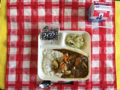 チキンカレーライス、ビーンズサラダ、ミニフィッシュ、牛乳