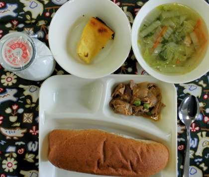 豚肉のデミグラスソース煮、はくさいのスープ、かぼちゃのプリン、ライ麦パン、牛乳