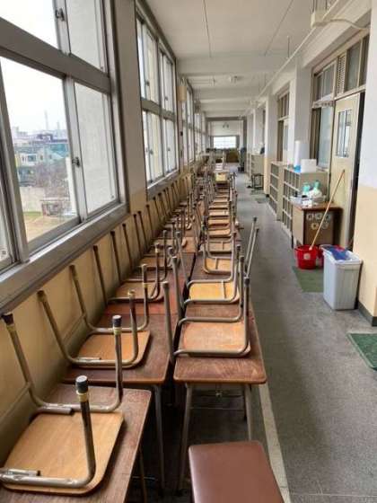 1年間使った教室の清掃とワックスがけを休業期間中に行います。きれいになった教室で、児童を待ちます。