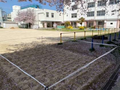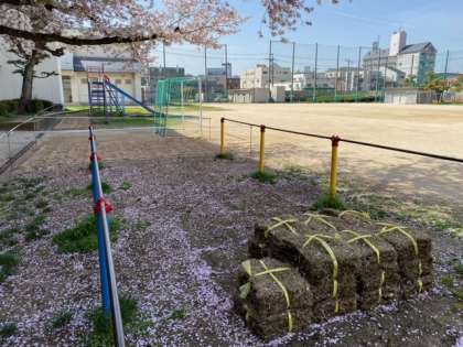 芝生の補植をしています。芝生が根付くまでの養生期間、入らないように気をつけましょう。やがて鮮やかな緑一面の芝生になります。