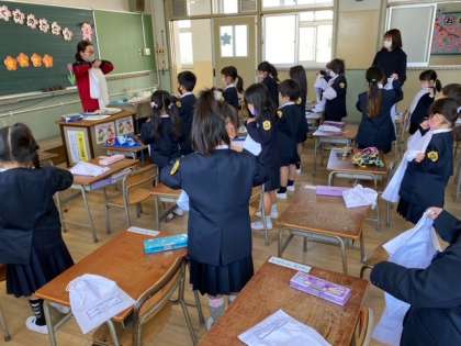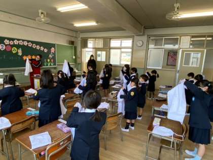 給食の準備や片づけ、手洗いの仕方、エプロンの片づけ方などを学びました。