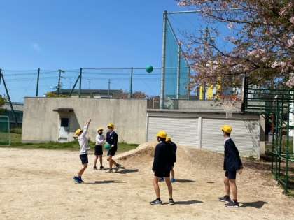 ボール遊びや鬼ごっこをしています。学年や学級が変わっても、遊ぶときは一緒です。