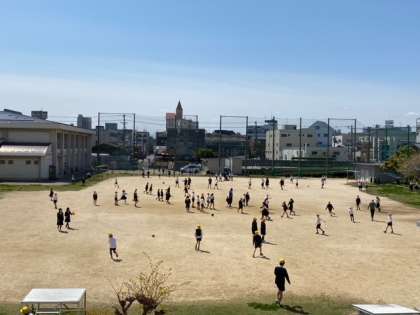 青空が広がっています。子どもたちが元気に運動場で遊んでいます。