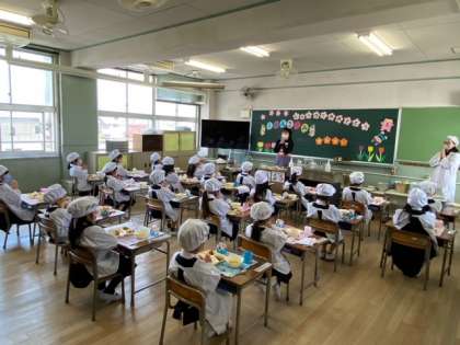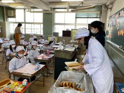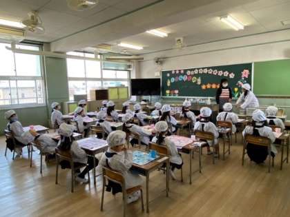 準備ができるまで静かに待っています。手を合わせて「いただきます」のあいさつをしました。初めての給食、おいしかったですか。