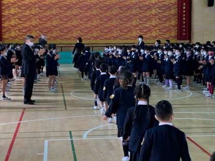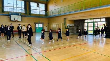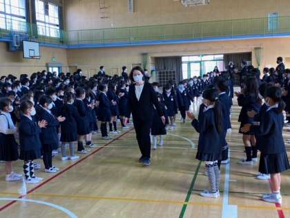 新1年生が少し緊張気味で入場してきました。2〜6年生のお兄さんお姉さん、先生たちが手拍子で温かく迎えています。