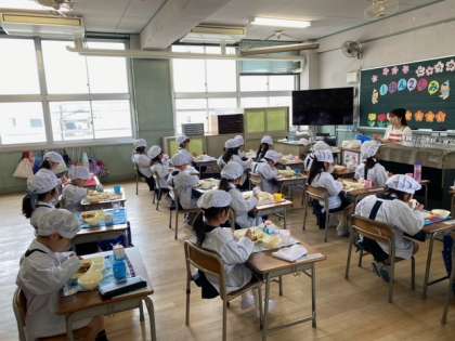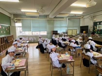 今日は「入学お祝い献立」です。子どもたちが、カツカレーライスを美味しそうに食べていました。