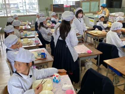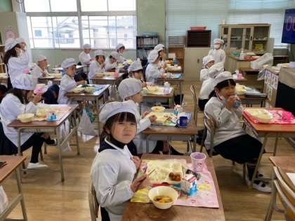 2年生の給食の時間のようすです。おいしい給食に思わず笑顔がこぼれます。
