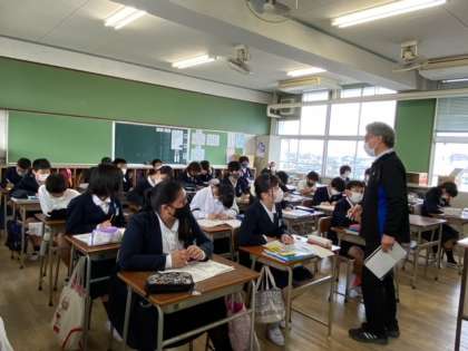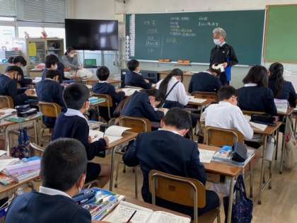 日本国憲法について学習しています。「3つの原則」の内容を先生から詳しく教わっています。