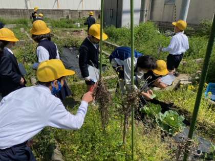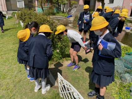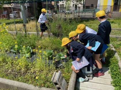 「春の生き物」の単元です。「季節の生き物を観察しよう」のプリントを手に、子どもたちが、レインボーパークや学習園で、花や虫を探して観察していました。