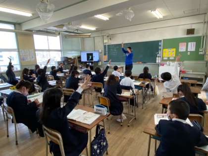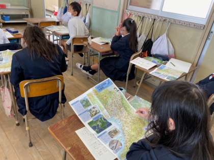 「大阪府のようす」〜自分たちの住んでいる「大阪府」の位置や特色について学習していきます。大阪府の大きい地図を見ています。地図はいろいろなことを教えてくれます。