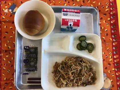 焼きそば、きゅうりのしょうがづけ、黒糖パン(1/2)、牛乳