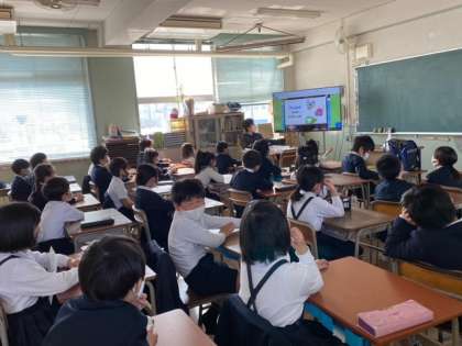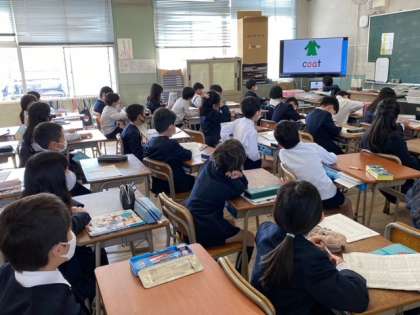 3年生の教室では、大型テレビに流れる「英単語」の音声を聞いて、子どもたちが一緒に発音していました。