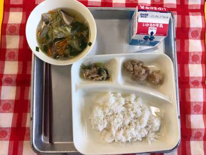 鶏肉のからあげ、中華スープ、チンゲンサイともやしの甘酢あえ、ご飯、牛乳