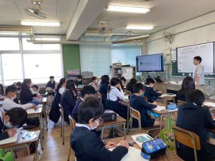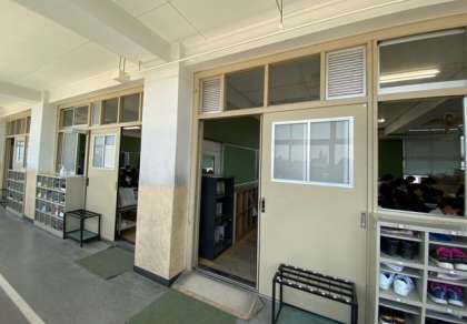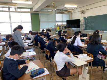 教室の窓とドアを開放し、換気をしながら学習しています。
