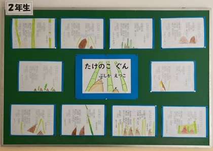 教科書の「たけのこ ぐん」の文章を、子どもたちが視写しました。「たけのこ」の絵も添えました。細かいところまでよく描いています。色合いも素敵です。