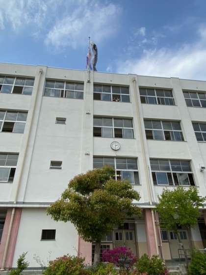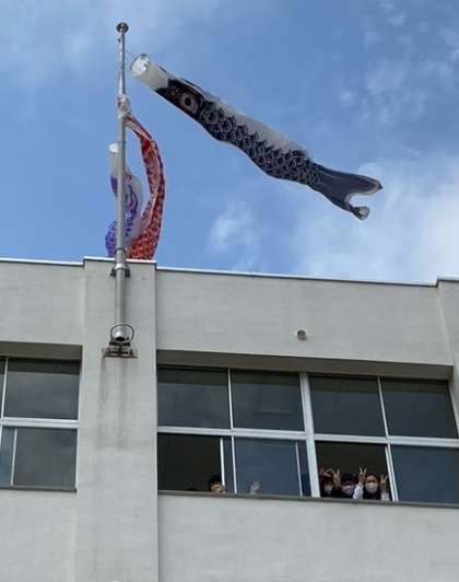 校庭からふと上を見上げると「校長先生!」と6年生の児童が手を振ってくれました。風にそよぐ鯉のぼりが子どもたちにぴったりです。