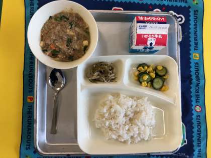 マーボーどうふ、きゅうりとコーンの甘酢あえ、もやしとピーマンのごまいため、ご飯、牛乳