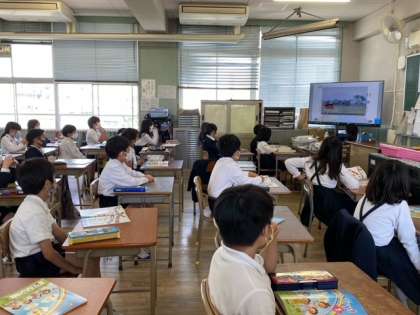 外国語活動です。世界にはたくさんの国があります。さまざまな国のあいさつや生活の様子を、大型テレビの映像を見ながら学習しました。