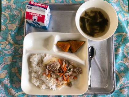 豚丼、湯葉のすまし汁、かぼちゃのしょうゆ焼き、牛乳