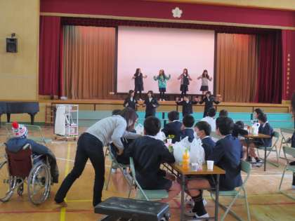 自分たちで考えた出し物を、グループごとに舞台で発表していました。