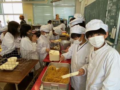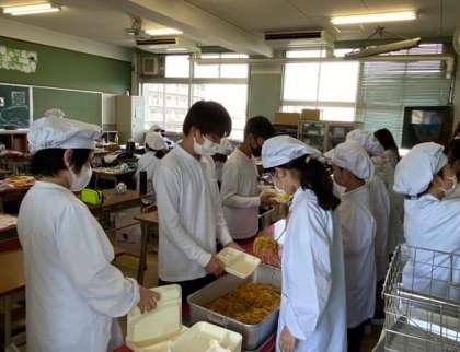 当番の児童が配膳作業をしています。今日はカレースパゲッティです。