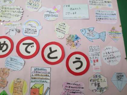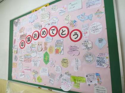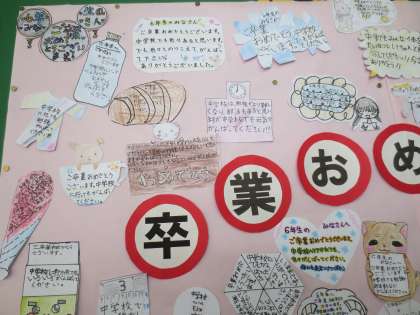 4階の廊下掲示板に5年生のメッセージがはられています。