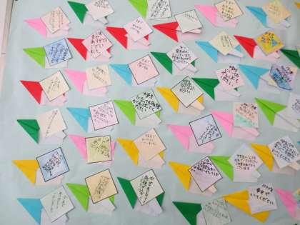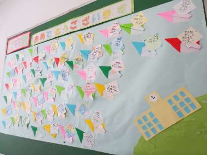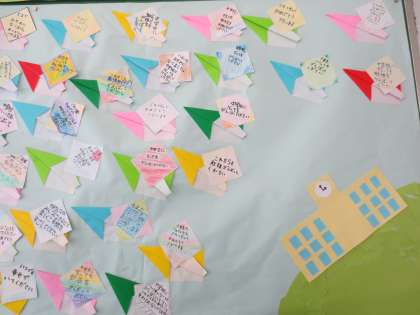 3階の廊下掲示板に3年生のメッセージがはられています。紙飛行機にメッセージが書かれています。6年生は大空高く飛び立っていってくれるでしょう。