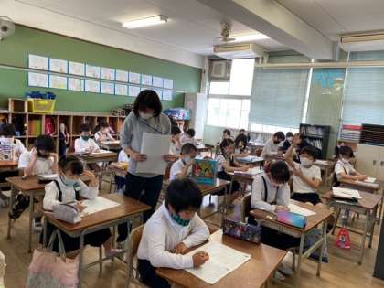 2組では、「たし算のひっ算」の単元テストをしていました。