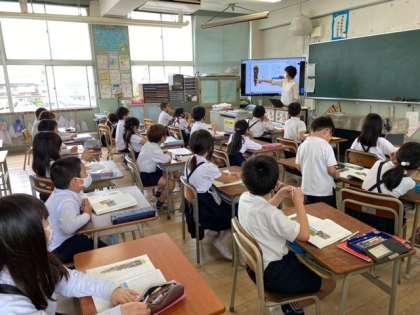 1組の国語科では、教科書の「たんぽぽ」を段落ごとに読み、先生の問いかけに手を挙げて答えていました。たんぽぽの「ね」はとてもながいですね。