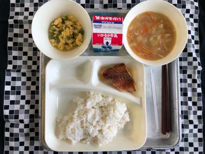 赤魚のしょうゆだれかけ、みそ汁、えんどうの卵とじ、ご飯、牛乳
